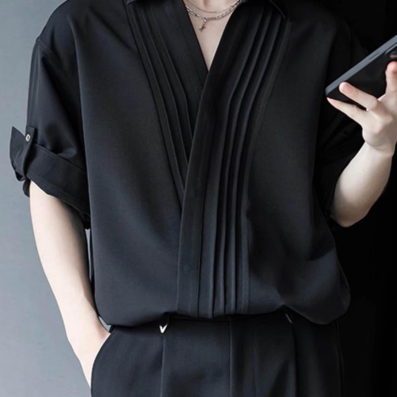 TEMU INCERUN 남성용 스타일리시 솔리드 폴로 칼라 반팔 플리츠 이지 레트로 워크 포멀 셔츠