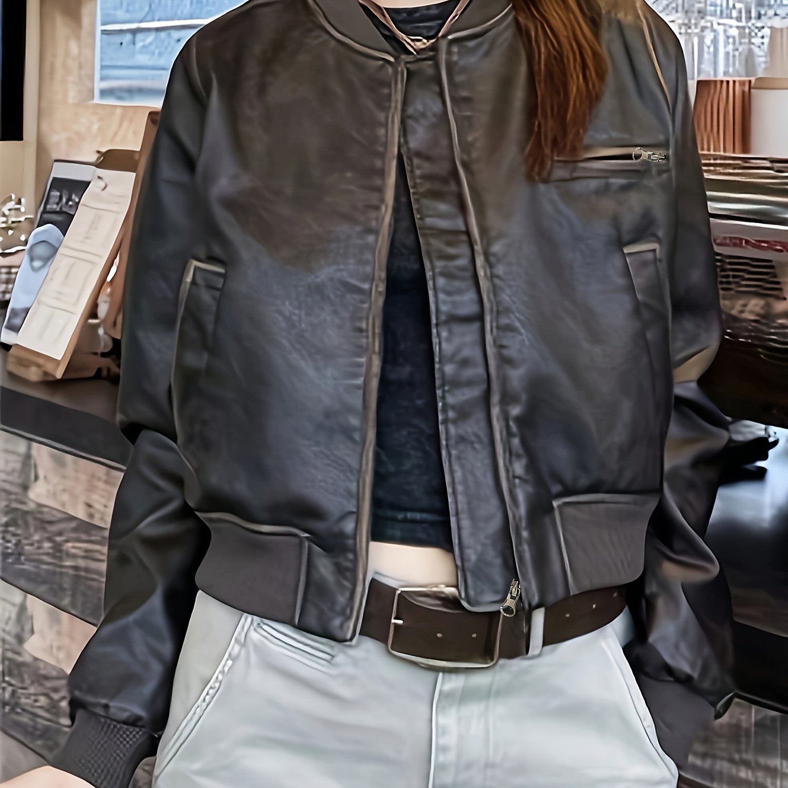 TEMU BAE 여성 빈티지 브라운 인조 가죽 봄버 재킷 - 긴소매, 지퍼업, 골지 커프스, 봄/가을 캐주얼 스타일, 외출, 파티, 개학에 적합, 캐주얼 아우터 | 빈티지 봄버 재킷 | 지퍼 재킷, 여성 가을 재킷, 여성 겨울 재킷, 여성 가을 재킷, 여성 겨울 재킷, 여성 가을 재킷, 여성 가을 재킷|빈티지|여성의류|패션