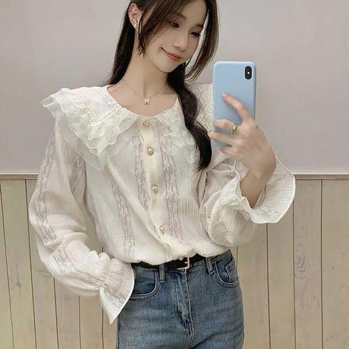 [에이치플러스몰]여성 레이스 봄 블라우스 프릴 진주버튼 와이드카라