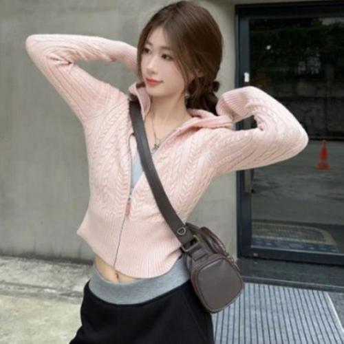 [다잇템]여성 니트케이블 집업 후디 슬림핏 짧은 짜임