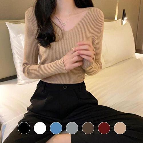 [에이치플러스몰]브이넥 긴팔 니트 티셔츠 여자 이너 쫄티