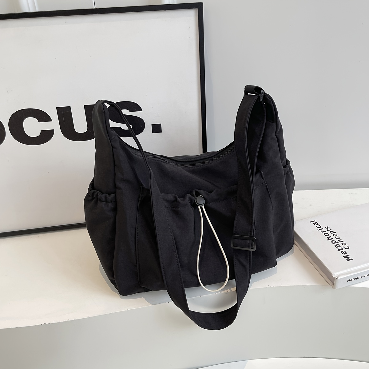TEMU 여성용 솔리드 컬러 드로스트링 멀티포켓 대용량 크로스바디백, 트렌디 숄더 커뮤터 캐주얼 대학생 핸드백