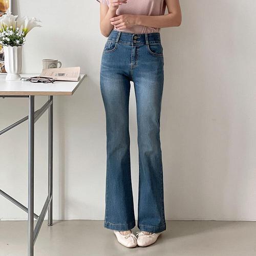 [다잇템]여성 투버튼 하이웨스트 워시드 나팔 청바지