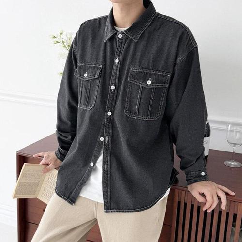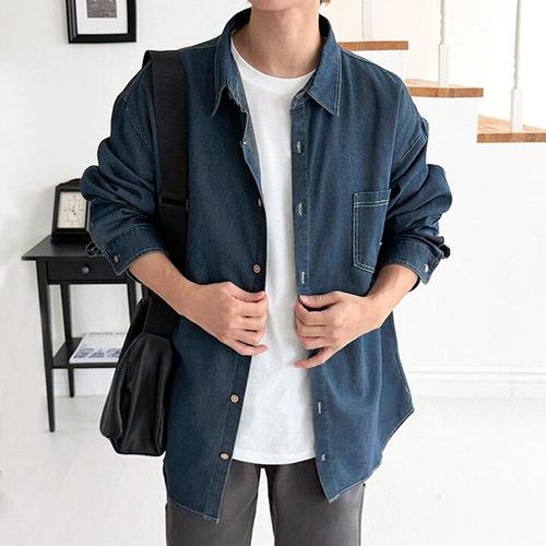 [보슈아][sado]남성 청남방 오버핏 포켓 데님 셔츠 긴소매 MSF5002
