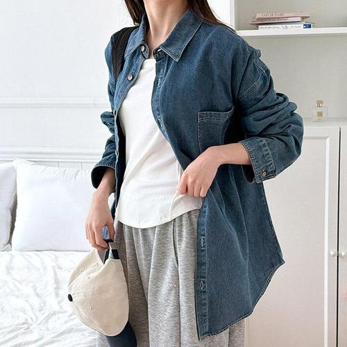 POMTOR 여성 베이직 데님 셔츠 데일리 긴팔 루즈핏 잠바 청남방