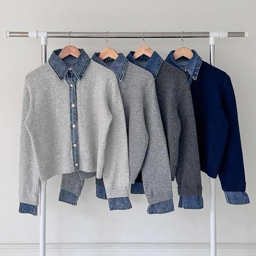 [옷자락] 여성 배색 카라넥 레이어드 가디건 니트 버튼 청남방