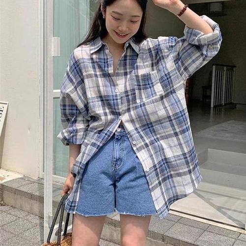 [셀러허브_여성트랜드패션]ONM 쿨샵 여성 루즈핏 빈티지스타일 체크셔츠 포켓 롱