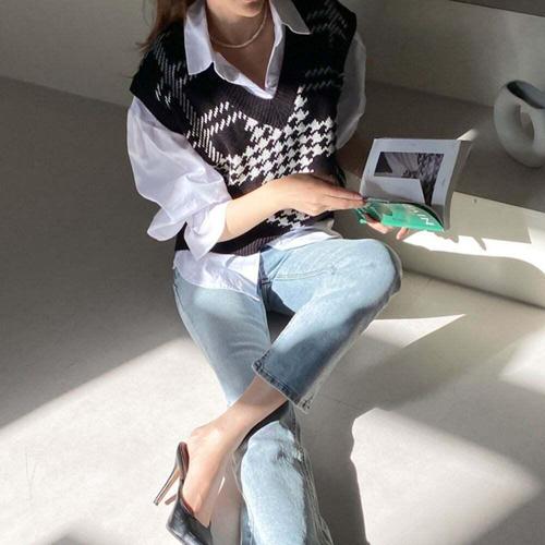[굿쇼핑몰_의류]3컬러 브이넥 하운드 민소매 반팔 니트 체크 베스트