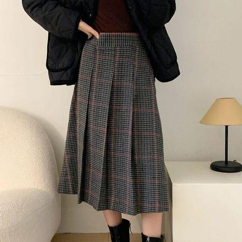 ANYOU 체크 스커트 가을 겨울 롱 스커트 플리츠 스커트 베이직 A라인 스커트