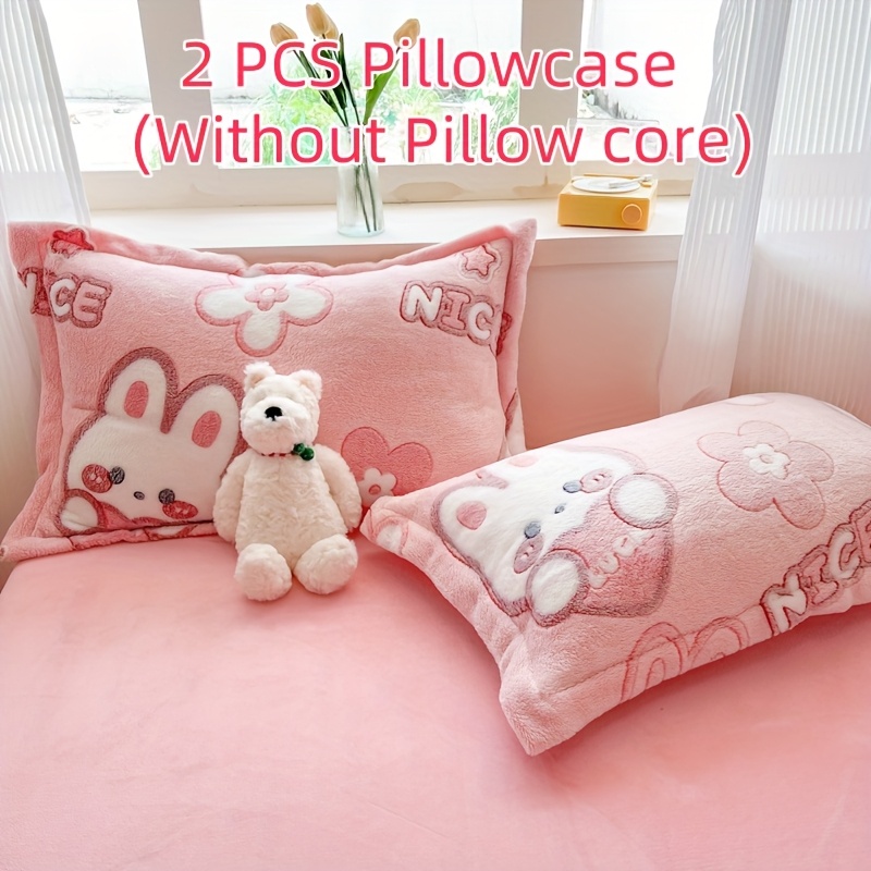 TEMU 두꺼운 눈꽃 벨벳 토끼 & 꽃 베개 커버 한 쌍 - 부드러운 핑크색 침구 지퍼 클로저, 세탁기 사용 가능, 200-250gsm 폴리에스터, 귀여운 토끼 & 꽃 디자인의 아늑한 침실 장식용, 토끼 장식, 침실 액세서리, 재미있는 디자인, 지퍼 베개 커버, 부드러운 질감