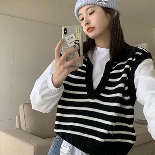 [라일리여성의류] Rly 봄 여성 니트 조끼 카라 여성 크롭 조끼 민소매