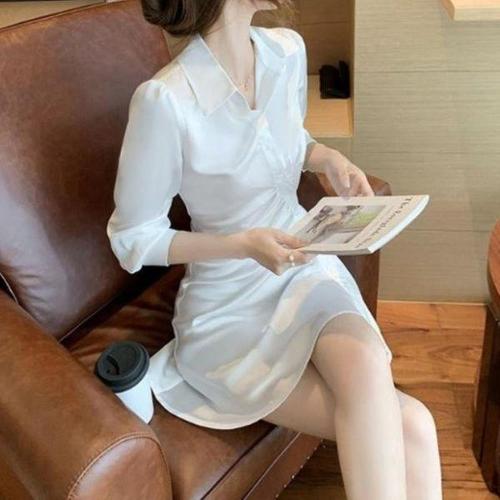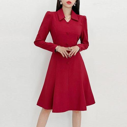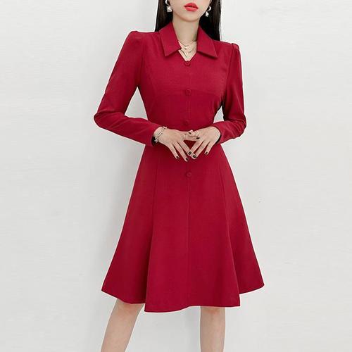 [신상오픈런]여자 무지컬러 사선 단추 언발 카라넥 미니 원피스
