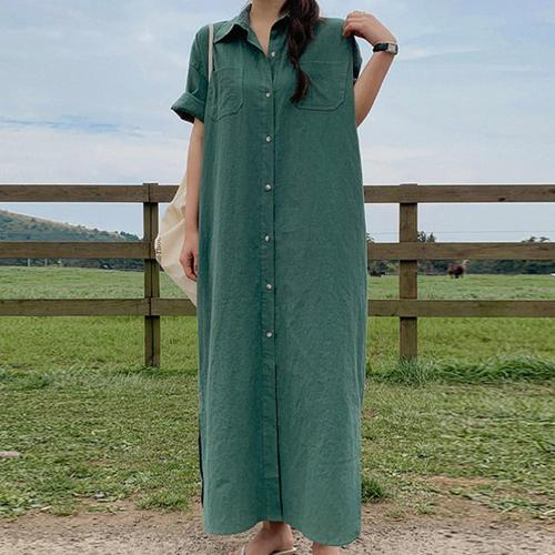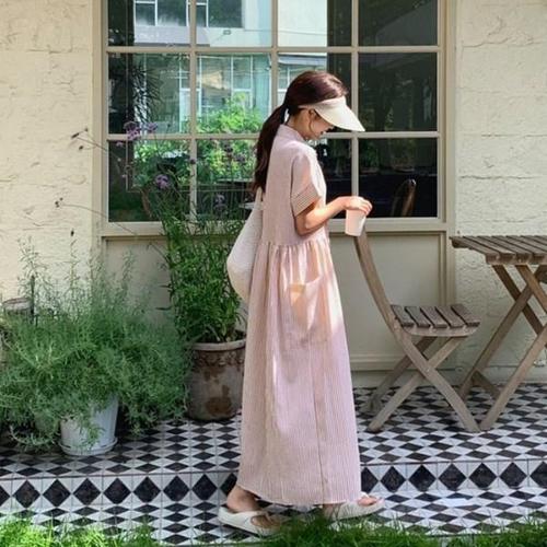 [다잇템]여자 반소매 베이직 카라넥 버튼 줄지 원피스