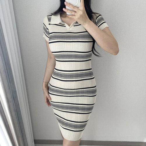 글램핏 / 썸머 PK 카라 골지 슬림핏 스트라이프 단가라 반팔 미디 원피스