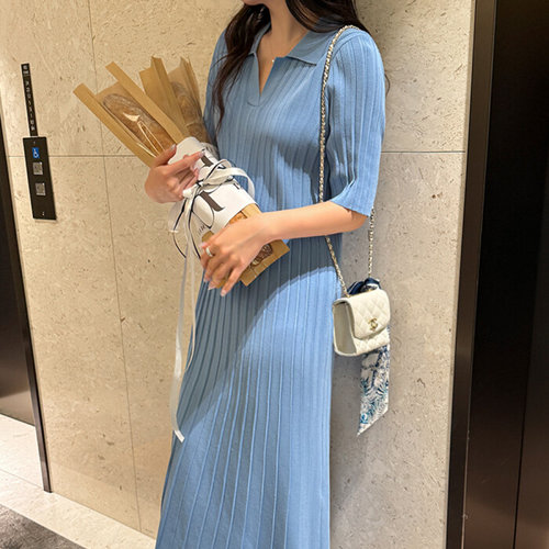 Latium HC06 깔끔한 꽈배기 카라니트 플레어 플리츠 세미 정장 롱원피스 T