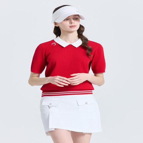 [챌린저]여성 배색 라인 카라 반팔 니트 레드_CHF2WKT6627RD_IC