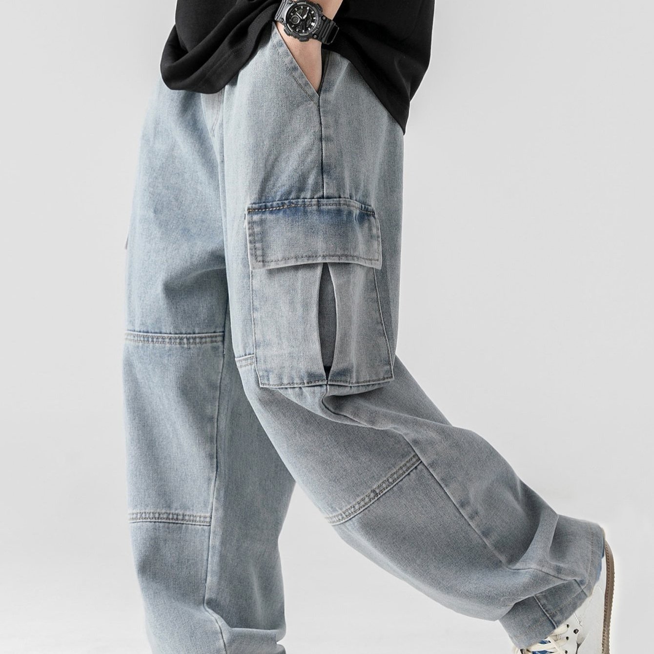 TEMU 남성용 빈티지 워싱 청바지 입체 포켓 와이드 데님 카고 롱팬츠