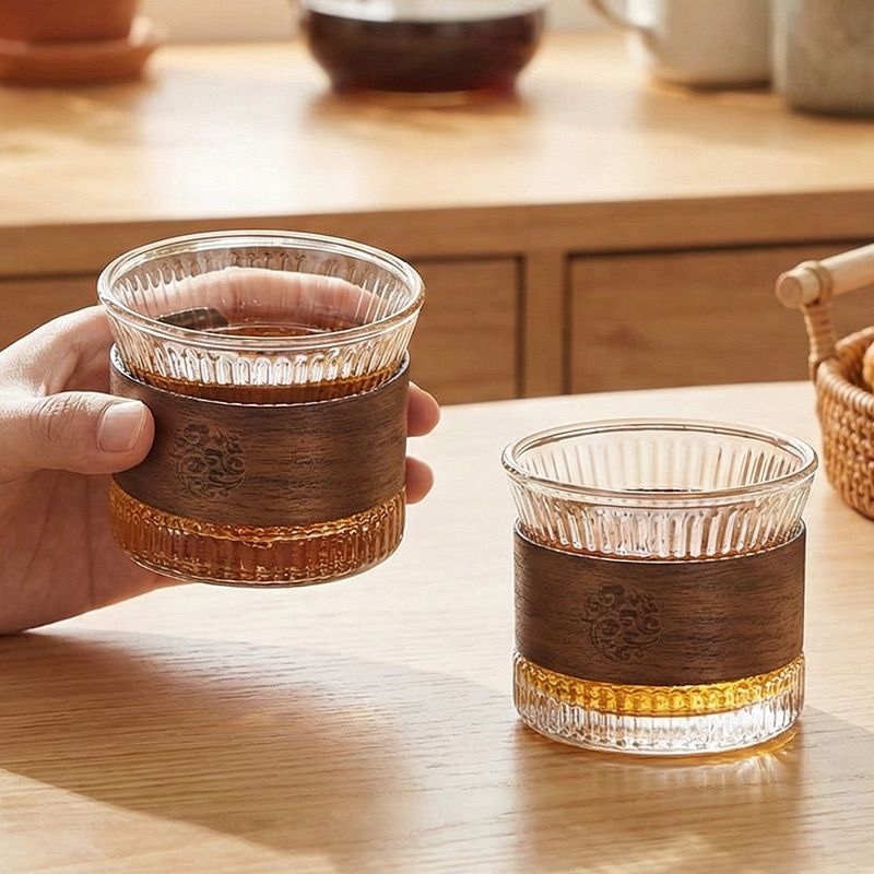 호두나무 홀더 내열유리 플리츠 찻잔 170ml