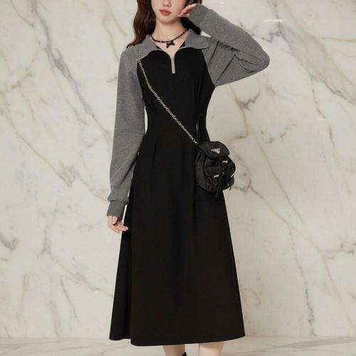 [미라클세븐]여성용 가을 겨울 컬러 블록 카라 집업 긴팔 드레스