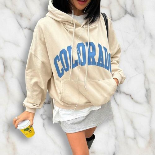 [미라클세븐]여성 컬러 배색 프린트 후드 티셔츠