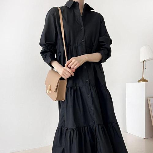 [샵앤][샵앤] 여성 카라 단추 4단 캉캉 셔링 롱원피스 ARA-WDR-4949-블랙