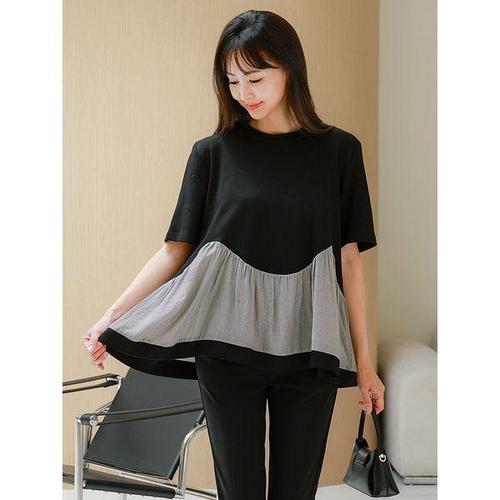 [드리다]여성 여름 배색 플레어 반팔 티셔츠 40-50대 미시 캐주얼 등원 출근 모임 오피스룩 하객 학부모 ..