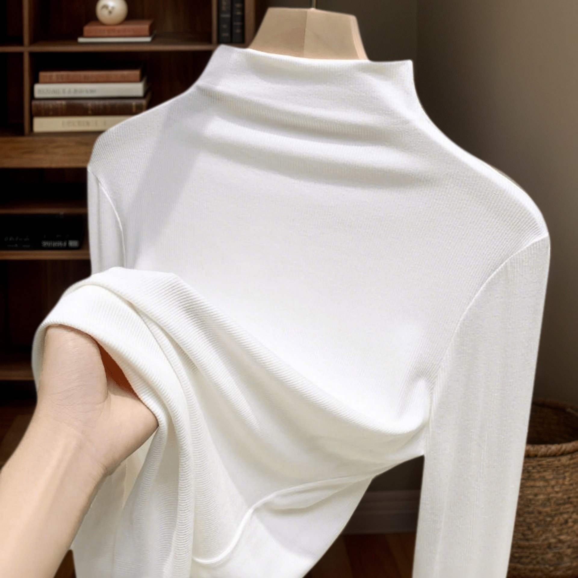 TEMU 여성용 화이트 고탄력 하프터틀넥 티셔츠 - 롱 슬리브 레이어링 탑, 라운드넥 솔리드 컬러 블라우스, 봄/가을용, 캐주얼 & 포멀웨어, 주름 방지, 세탁기 사용 가능 (베이지/브라운/블랙/네이비) - 다용도 베이스|셔츠