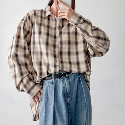 ANYOU 커플 추동 루즈핏 체크 긴팔 셔츠