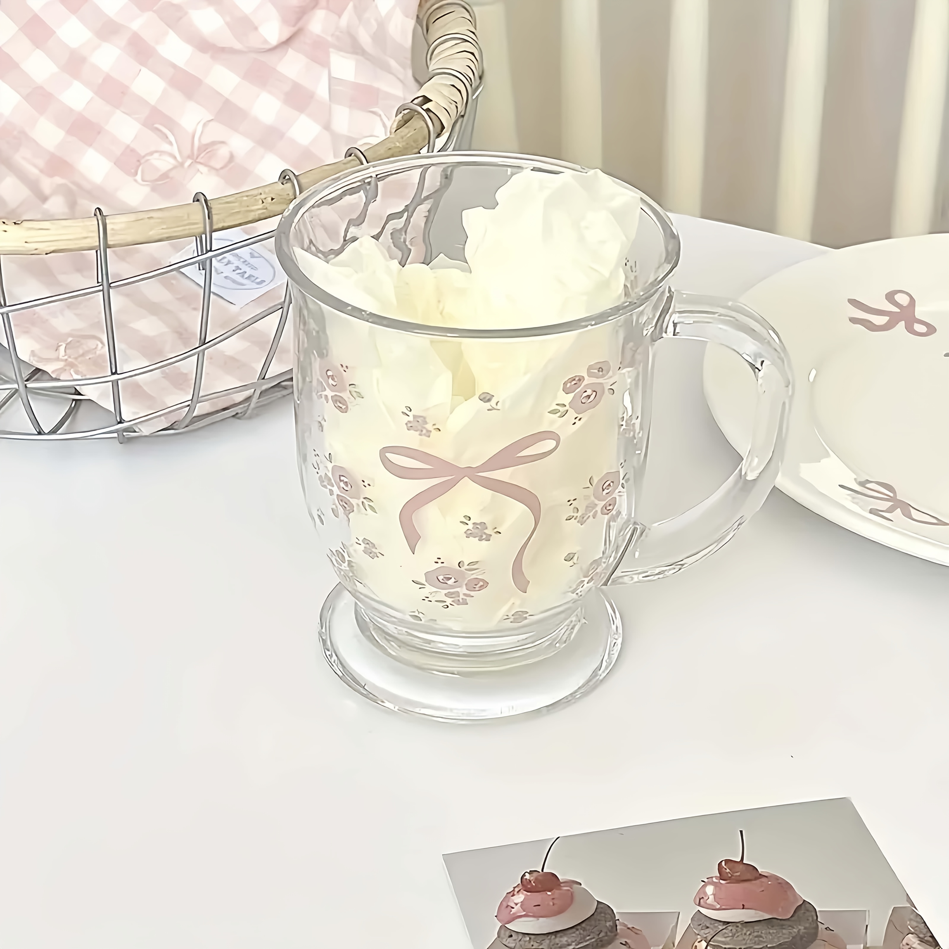 TEMU 재사용 가능한 유리 커피 머그컵 - 15.21oz 프렌치 스타일 장미 리본 패턴, 우유, 커피, 주스에 적합한 다용도 아침 컵. 손세척 전용; 재활용 소재로 제작, 크리스마스, 추수감사절, 발렌타인데이, 어머니날, 졸업 시즌에 이상적