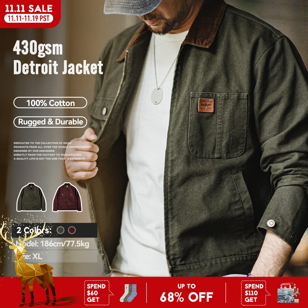 Maden 레트로 헤비급 캔버스 디트로이트 자켓 코듀로이 칼라 포켓이있는 사냥 짧은 지퍼 업 자켓 남성용 가을 겉옷