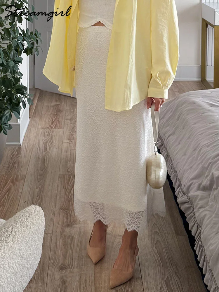 화이트 레이스 스커트 맥시 바디콘 여성 여름 오피스룩 우아한 정장 스커트 레이스 여성용 밴딩 허리 레이스 블랙 스커트 롱