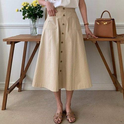 제이클래식 / 버튼 양포켓 플레어 스커트 바이오면 뒷밴딩