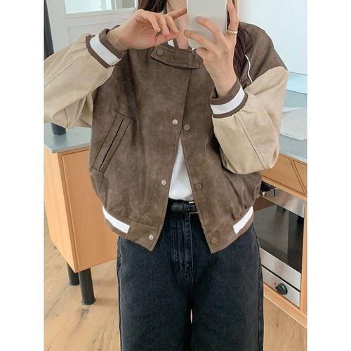 [탑온탑]크롭 배색 레더 바시티 자켓