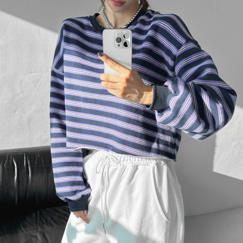 플러리싱 / 양기모 배색 스트라이프 컷팅 크롭 맨투맨 플러리싱