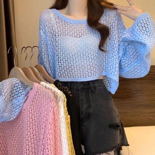 [옷자락]여자 루즈 크롭 펀칭 긴팔 비치 커버업 니트