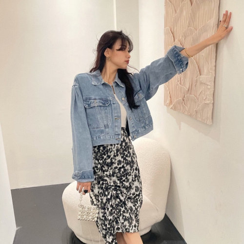 [유아몽드]슬림핏 카라넥 숏 반팔 청자켓 데님 허리라인 주름 핀