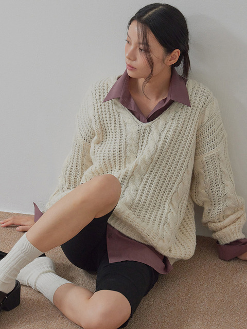 [탑걸] 딥 브이넥 코지 케이블 니트 탑_T521TP109