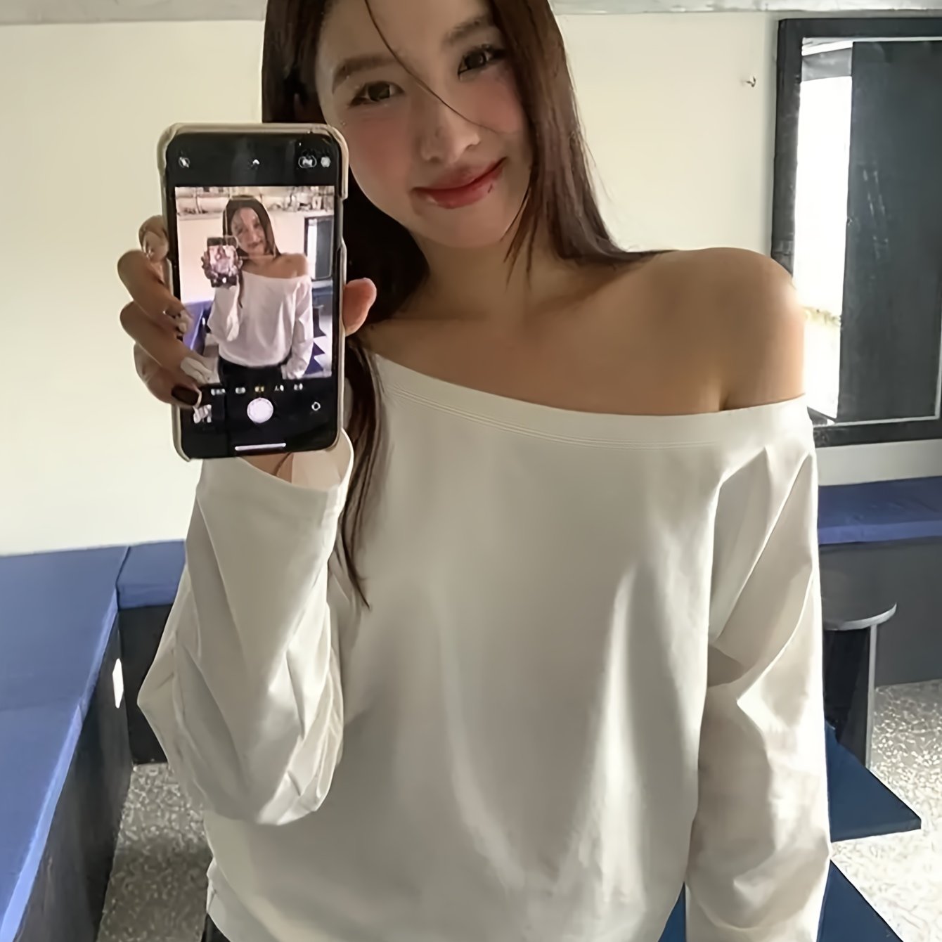 TEMU 여성용 화이트 루즈 오프숄더 긴팔 티셔츠, 베이스 레이어 탑으로 완벽