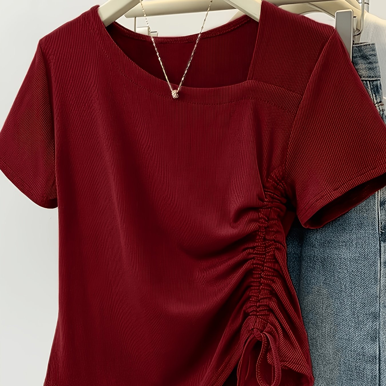 TEMU 여름 신상 비정형 디자인 드로스트링 반팔 티셔츠 캐주얼 솔리드 컬러 탑