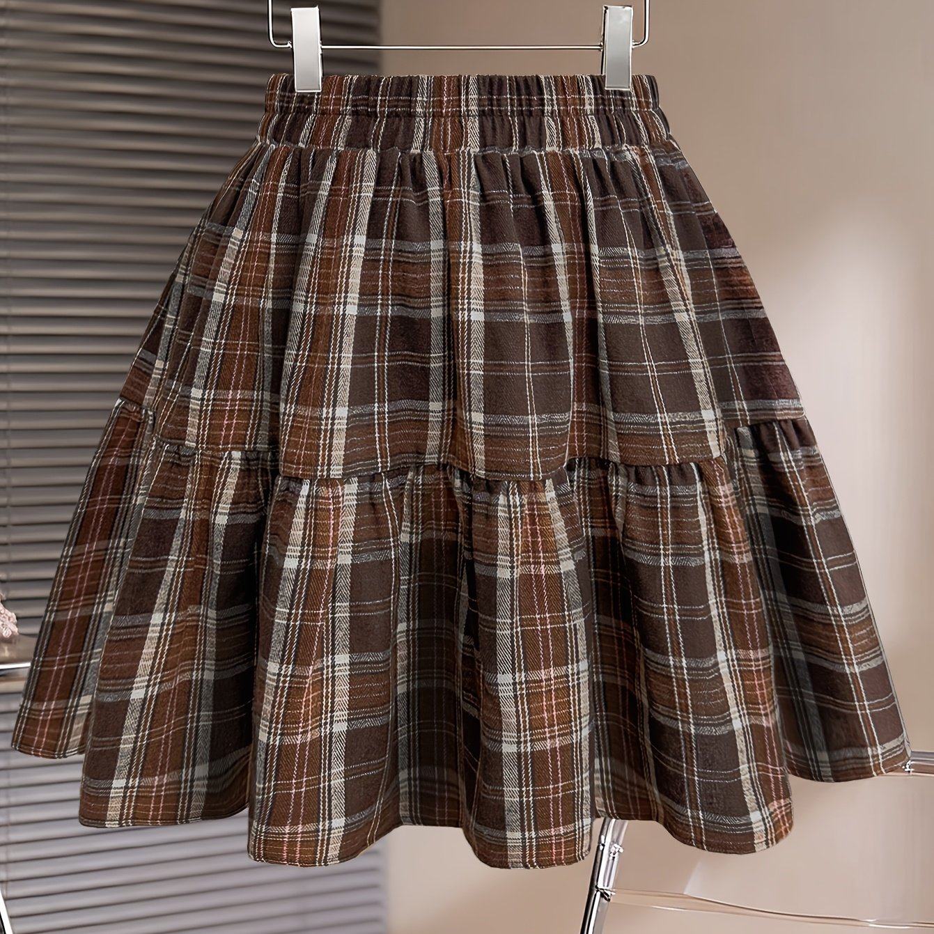 TEMU 플러스 사이즈 - 플러스 사이즈 - 여성 빈티지 체크 캐주얼 다용도 이중 레이어 패치워크 헤비 레이어 케이크 스커트, 플리츠 숏 스커트, 사계절용, 플러스 사이즈
