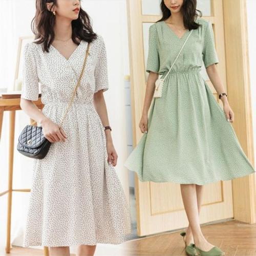 [XB5448K9]여성 데일리 브이넥 도트 플레어 원피스 투피스