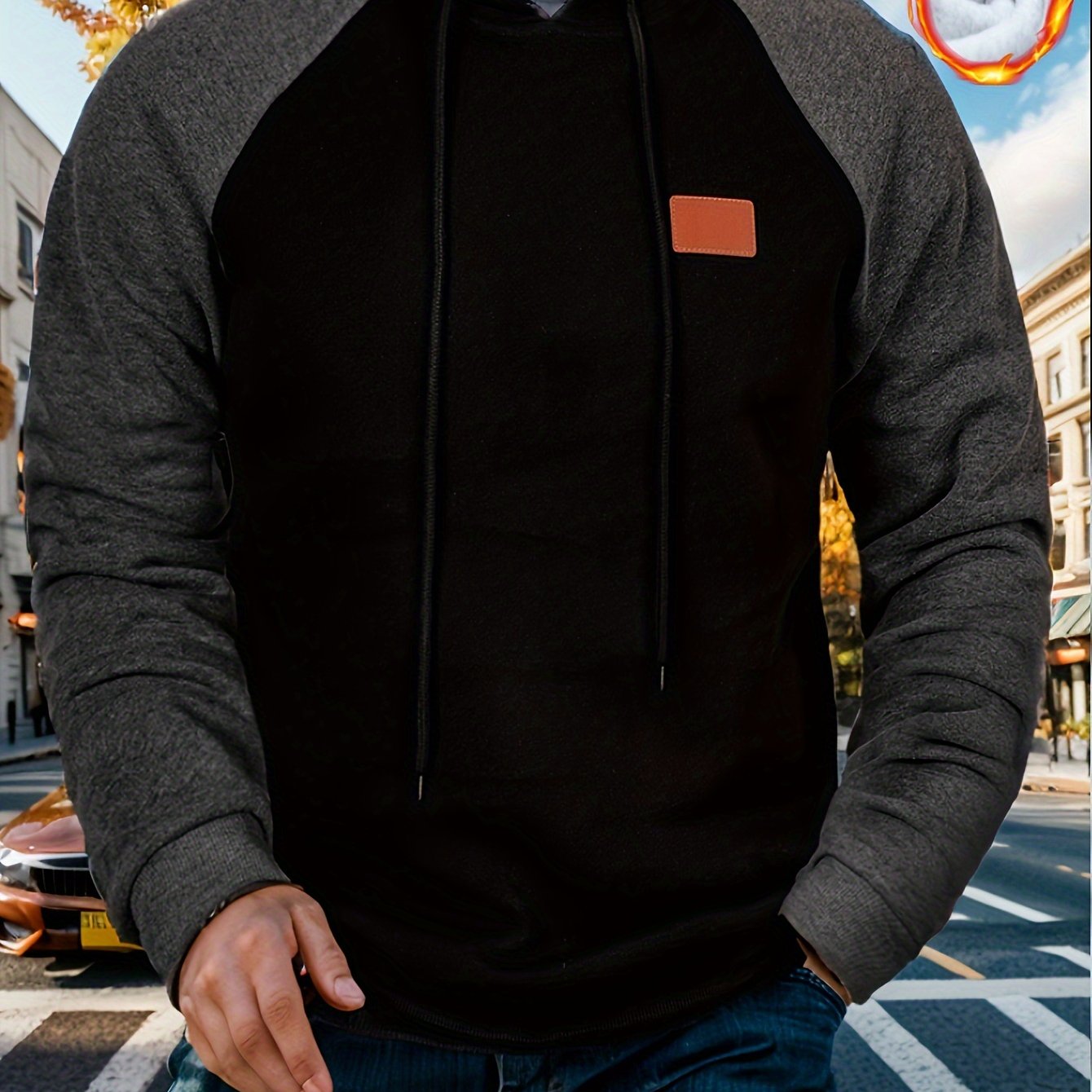 TEMU 라벨 패치워크 대비 색상 캥거루 포켓이 있는 남성용 후드 긴 소매 스웨트셔츠, 데일리 아우터웨어용 캐주얼하고 시크한 상의