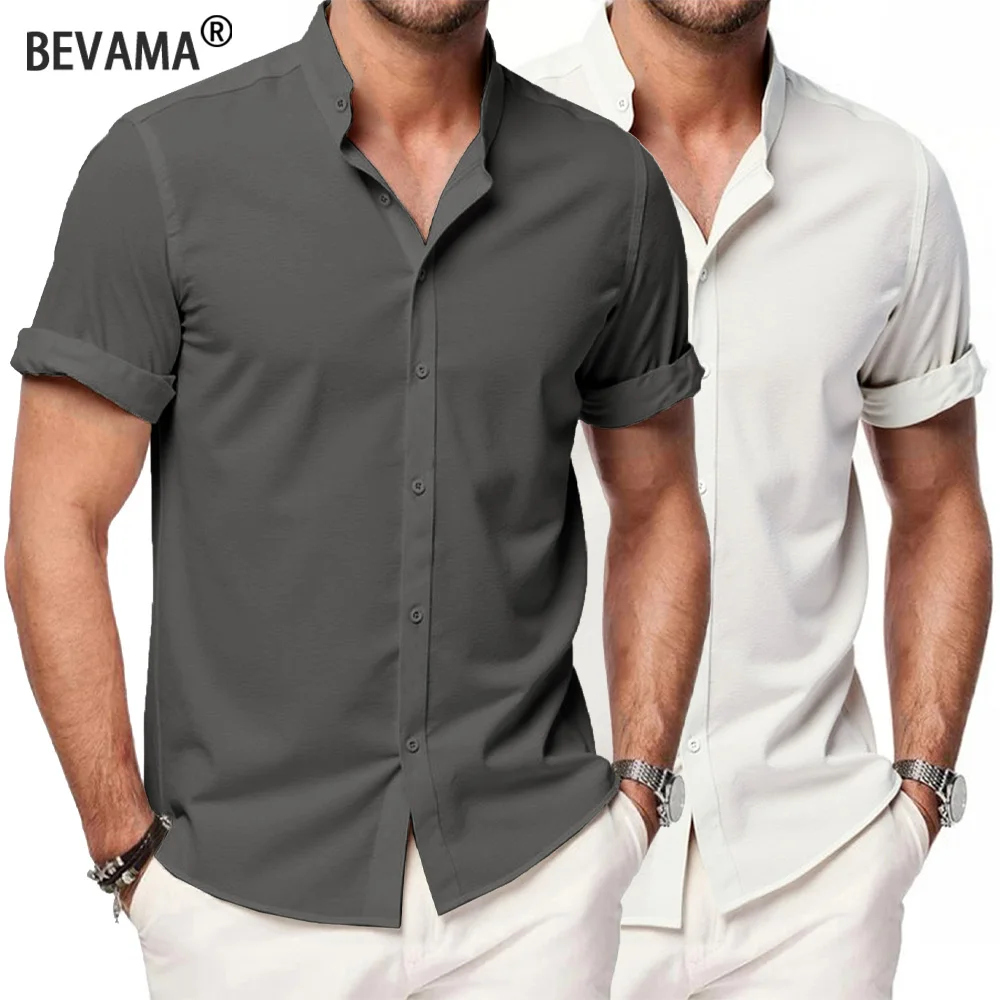 여름 남성 반팔 셔츠 단색 스탠드 칼라 티셔츠 루즈핏 캐주얼 비치 셔츠 통기성 남성 린넨 탑
