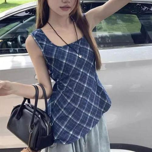 [셀러허브_여성트랜드패션]Rly 블루 체크패턴 백트임 포인트 슬리브리스 블라우스