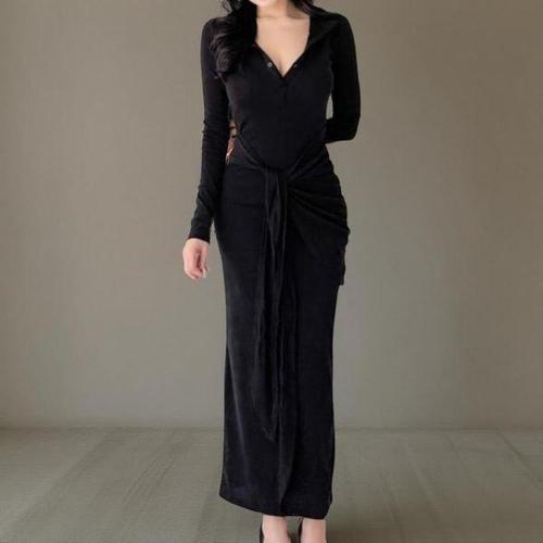 [신상오픈런]여성 단색 트임 버튼 스트랩 셔링 롱 드레스