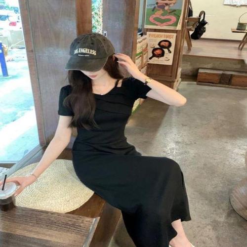 [에이치플러스몰]여자 여름 시크 꾸안꾸 블랙 트임 셔링 슬림 롱원피스