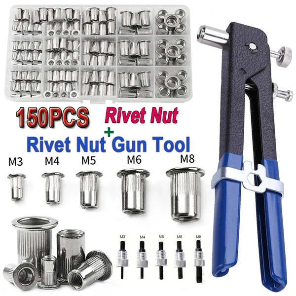 150PCS 리벳 너트 건 맨드릴 키트 M3/M4/M5/M6/M8 또는 너트 리벳 맨드릴 수리 도구 리벳건 플랫헤드스크류 팝 너트 리벳 건 세트