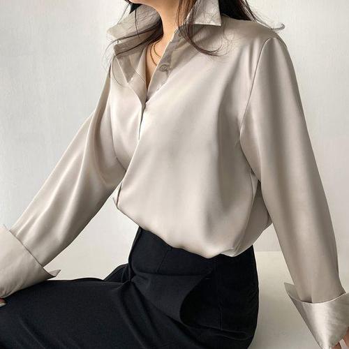 [네모엔룩]싱글새틴 실켓 공단 셔츠카라 롱 슬리브 블라우스
