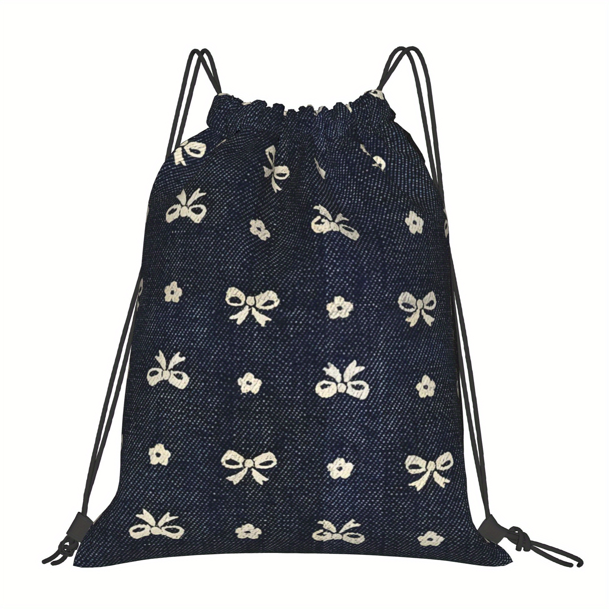 TEMU 데님 리본 드로스트링 백팩 - 흰색 꽃무늬가 있는 남해색, 부드러운 폴리에스테르, 포켓, 기계 세척 가능, 일상용 백팩|장식 백팩|내구성 있는 백팩