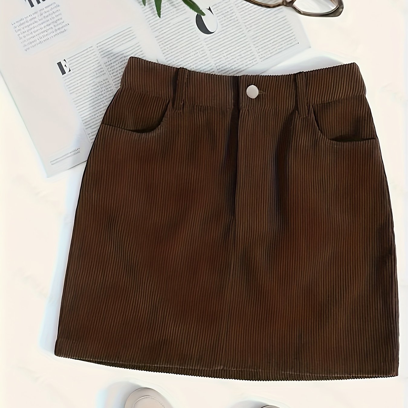 TEMU 포켓이 달린 우아한 브라운 코듀로이 스커트 | 편안하고 스타일리시하며 캐주얼 또는 포멀 웨어에 적합, 올 시즌 솔리드 컬러 숏 기장 스커트